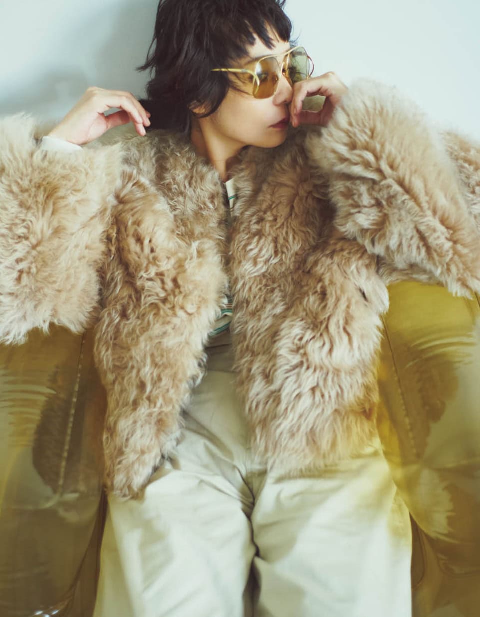 ボリュームたっぷりのファージャケットながら、コンパクトな丈感でどんなボトムとも相性抜群。チノパンでカジュアルダウンするとデイリーにすっとなじむ着こなしに。ファージャケット¥198,000、チノパンツ¥36,300(共にロエフ/エイチ ビューティー&ユース)、ロングTシャツ¥25,300(ロンハーマン)、サングラス¥72,820(ミュウミュウ/ルックスオティカジャパン カスタマーサービス)