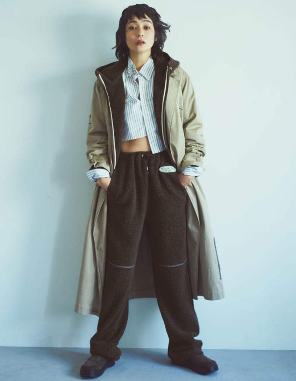 ウール混のボア素材を使用したアウトドアムード溢れるセットアップに、ストライプシャツとトレンチコートを合わせたトラッドMIXが洒落感たっぷり。ボアパーカ¥49,500、ボアパンツ¥34,100(共にザ シンゾーン/シンゾーン ルミネ新宿店)、シャツ¥66,000(オムガールズ/アダム エ ロペ)、グラフィック入りトレンチコート¥242,000(マディソンブルー)、シューズ¥53,900(フィーニー)
