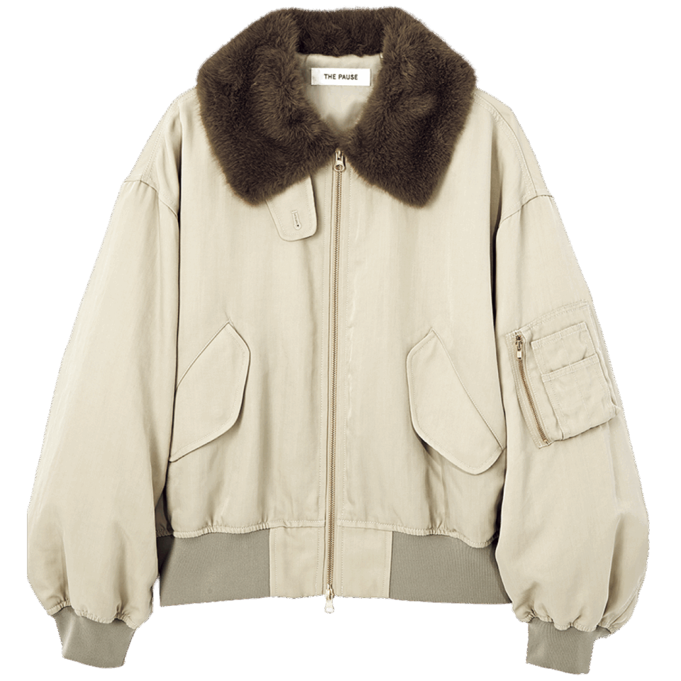 「フェイクファーの襟は、タブを留めればスタンドカラーに。防寒対策にも役立ちます。程よくツヤのあるナイロンツイル素材と、淡いニュアンスカラーで、キレイめなスタイルにも」Whim Gazette PR・畑中由香さん