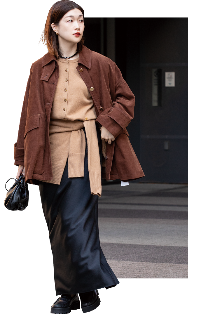 「トレンドのブラウンカラーのアウターを中心にインナーも同トーンに。他をブラックでまとめればブラウンが得意でない人も合わせやすいはず」