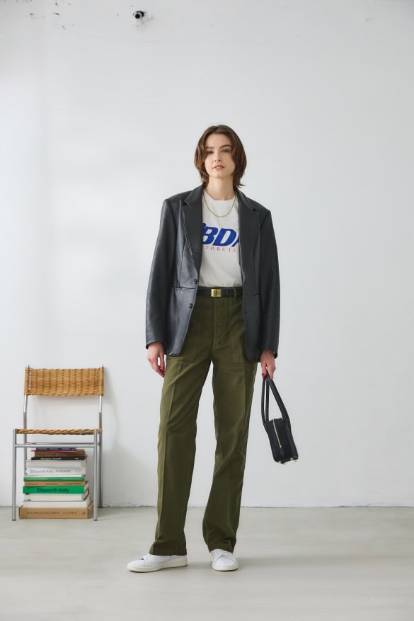 シルエットもサイジングもちょうどよく、私もこの秋はこのレザーばかり着ています。しかもこれ、編集部でかぶり買い(笑)。スエットなどのダル着が好きな私ですが、レザーのおかげで、手抜きに見えず!? 大活躍中です。買ってよかった!