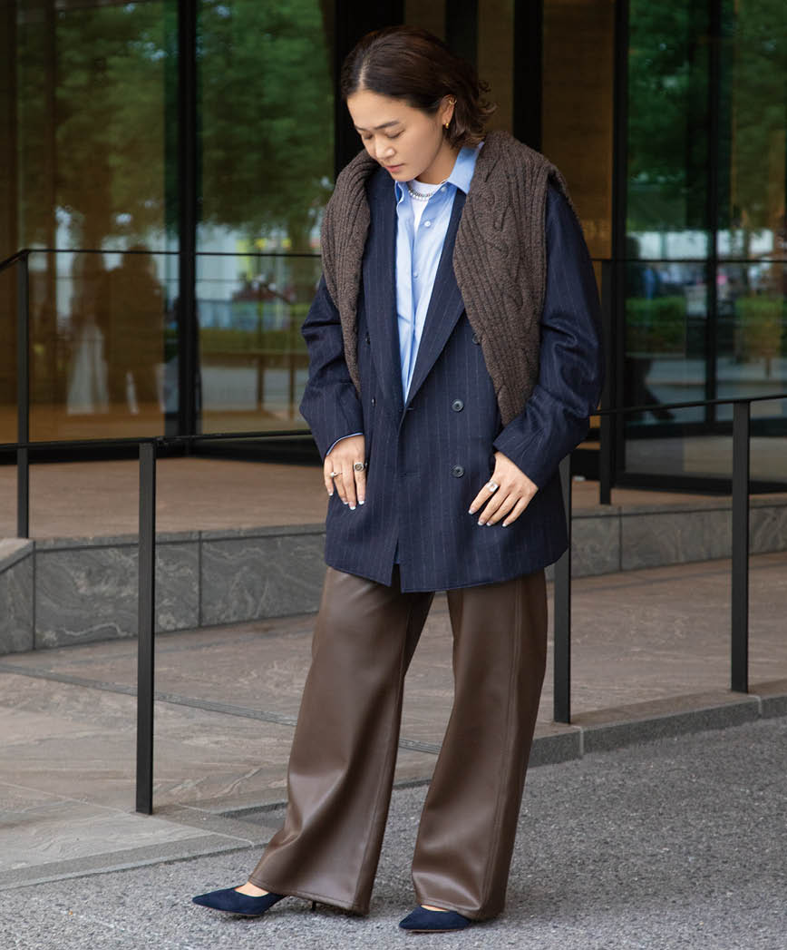 ジャケット¥132,000(ユーゲン フォー ユナイテッドアローズ/ユナイテッドアローズ 麻布台ヒルズ ウィメンズストア)、シャツ¥25,960、肩に掛けたニット¥38,940(共にユナイテッドアローズ)、パンプス¥108,900(ジャンヴィト ロッシ)、ネックレス¥42,900(アルポ/全てユナイテッドアローズ 六本木ヒルズ店)、パンツ¥42,900(チノ/ユナイテッドアローズ 有楽町店)、その他本人私物