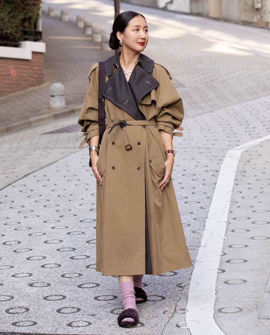 「配色使いがポイントのトレンチの足元はあえてパンプスやローファーでまとめず、ソックス×サンダルでハズしてヌケ感を意識しました」