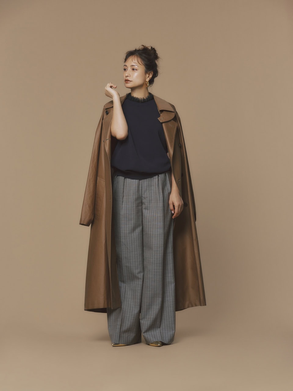 チェックパンツ¥75,900、半袖レース付きニット¥50,600(共にドゥロワー/ドゥロワー 青山店)、トレンチコート¥165,000(バウト)、シューズ¥68,200(ネブローニ)、左耳のシングルピアス¥53,900(マリア ブラック/ショールーム セッション)