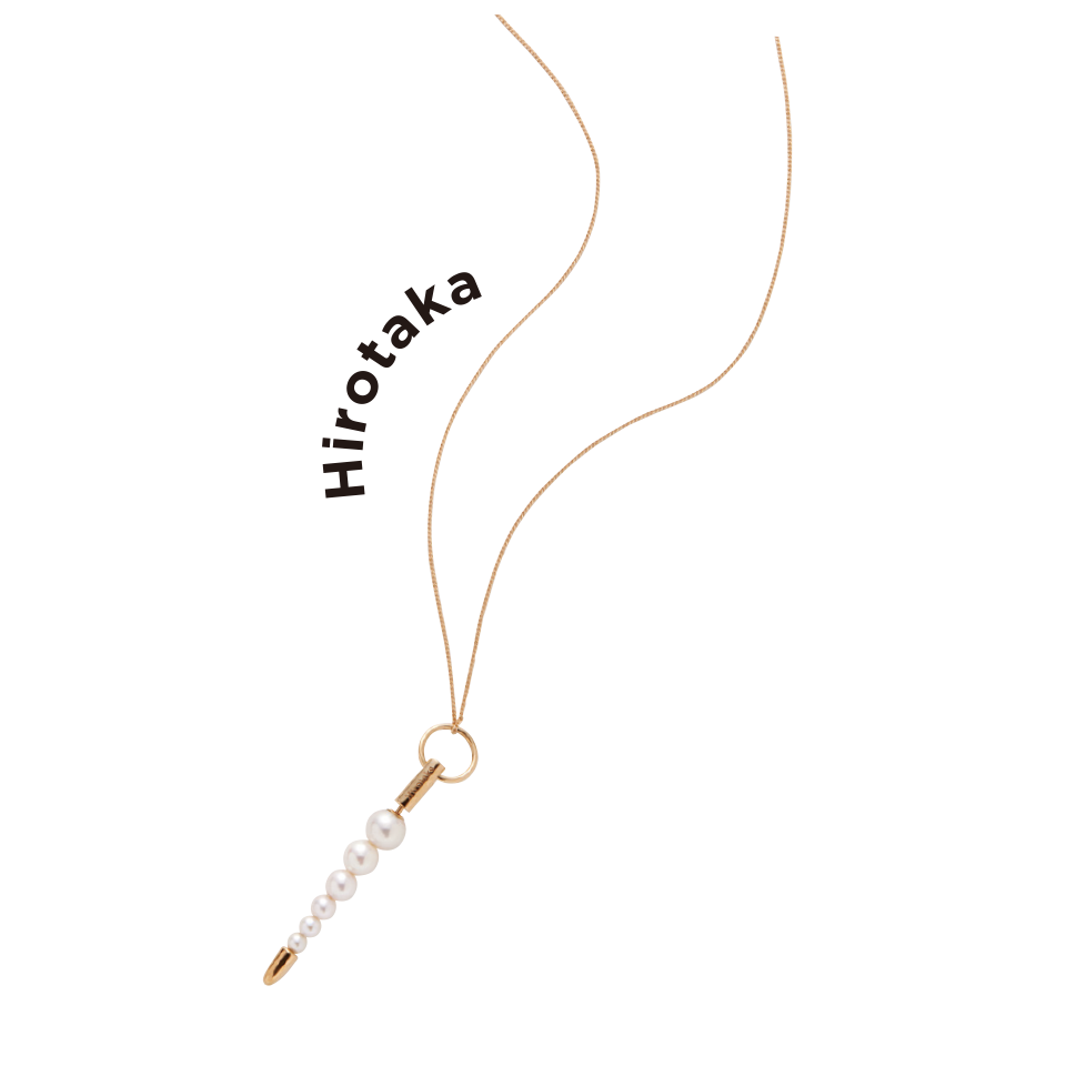 「かしこまり過ぎず、デイリーに使いやすいパールジュエリー」と金子さんが選んだヒロタカのネックレス。アコヤパールが描く直線に、先端のメタルティップのアクセントが光ります。