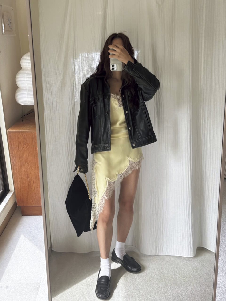 SEBAGOのローファー、ZARAのランジェリードレス、ヴィンテージのレザージャケット、Tabioのソックス、NEOUSのバッグは全て本人私物