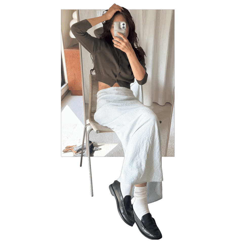 「先日お仕事で行ったニュージーランドのRUBYってショップで見つけた可愛いギンガムチェックのスカートが主役。渋い色のカーディガンやローファーで、大人のギンガムチェックスタイルに」。