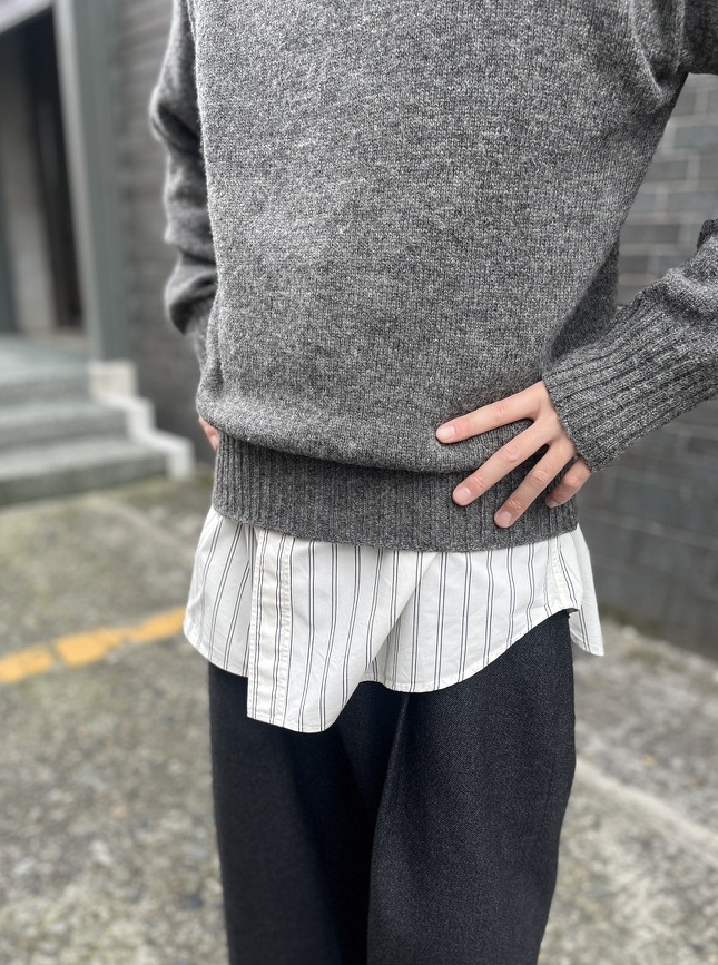 筆者には絶妙なバランスに見えましたが、「ニットに対して少しシャツが大きめだったかも」と安武さん。「シャツが大きめなのでちょっとシワが入ってしまいましたが、それをカムフラージュするべく、太めのパンツでバランスを図っています。ちなみにシャツをのぞかせるのは、1カ所か2カ所にするのが◎。とくに裾はシャツの見える分量が多くなるので、それ以外ものぞかせるとうるさく見えることもあるんです」