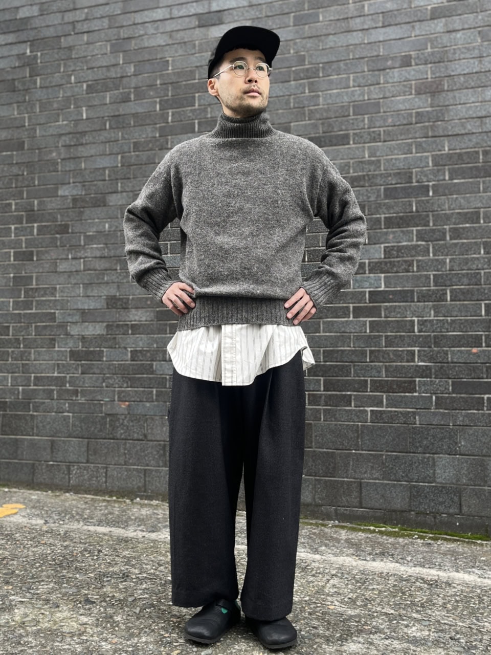 続いてタートルネックニット。そもそもシャツとレイヤードするトップスは、パーカとタートルネックがオススメだという安武さん。「クルーネックやVネックのニットとの相性も悪くはないのですが、すごくマジメに見えてしまうんですよね。トラッドな着こなしにはイイですが、こなれたレイヤードスタイルを作るなら、合わせるものはパーカかタートルネックニットがベストなんです」