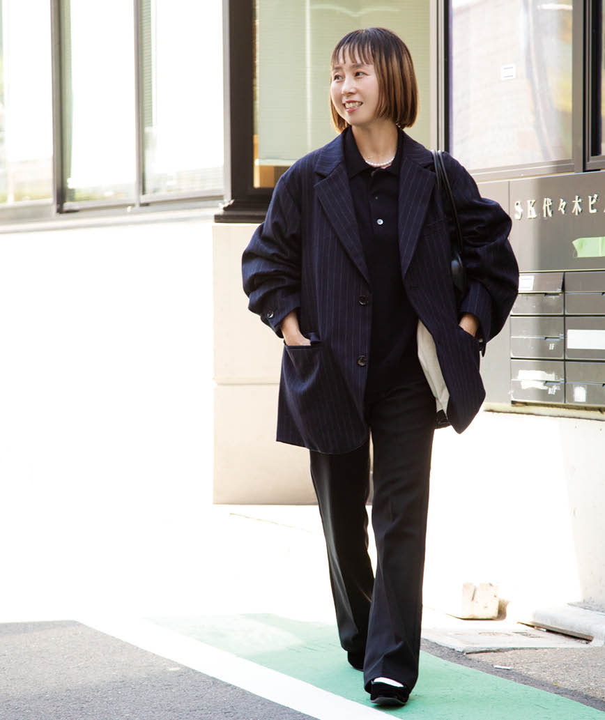 「きちんと感のあるストライプジャケットにトラッドなポロニットを合わせたのがポイント。メリージェーンやパールネックレスで女性らしさも意識」