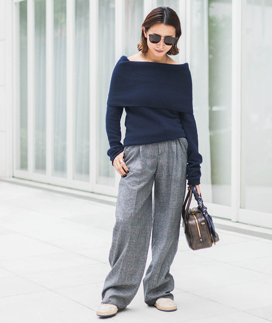 「チェックのスラックスにネイビーのオフショルダーニットで女っぽく。イタリアのストリートをイメージしたトラッドスタイルです」