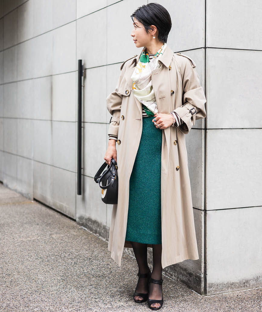 「トレンチを軸にしたトラッドなスタイリングに、グリーンのメタリックなスカートとスカーフを合わせて女性らしさと華やかさをプラス」