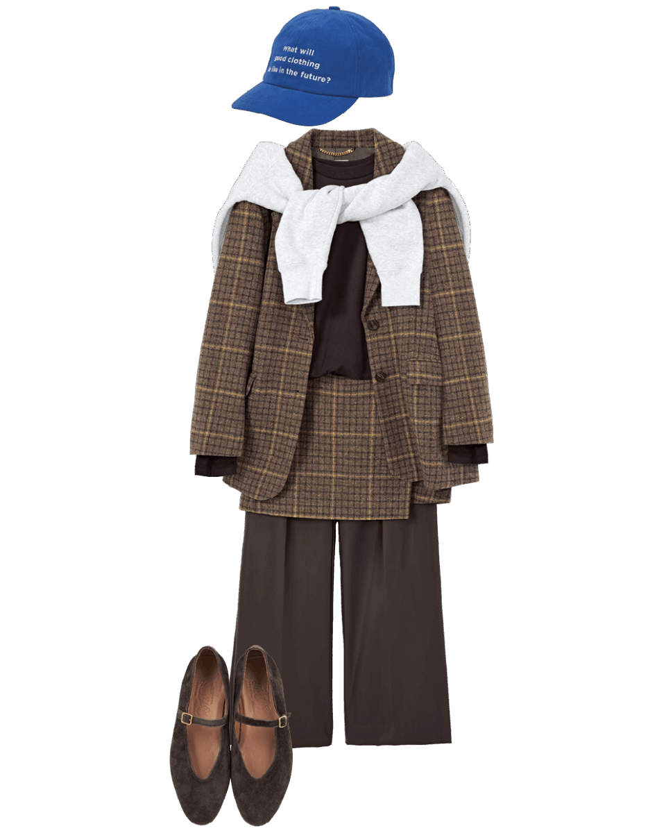 パンツ¥38,500(ジーヴィージーヴィー/grapevine by k3)、ジャケット¥58,300、スカート¥24,200(共にジャーナル スタンダード レサージュ/ジャーナル スタンダード レサージュ 銀座店)、Tシャツ¥18,700(エイトン/エイトン青山)、肩に掛けたスエット※参考商品(ユナイテッドアスレ/キャブ)、キャップ¥3,960(シテン/ユナイテッドアローズ カスタマーサービスデスク)、シューズ¥31,500(トゥティエ)
