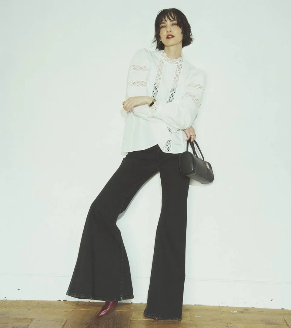 第4位は同率でもうひとつランクイン。大胆に裾が広がったフレアデニムに、ヴィンテージライクなコットンレースの甘ブラウスを合わせた、ちょっぴりボーホームードなスタイル。デニムはあえてブラックをチョイスすることでどこかモダンなムードも演出。組み合わせはシンプルながらも比留川游さんの美脚が引き立つ印象的なスタイルに注目が集まりました。