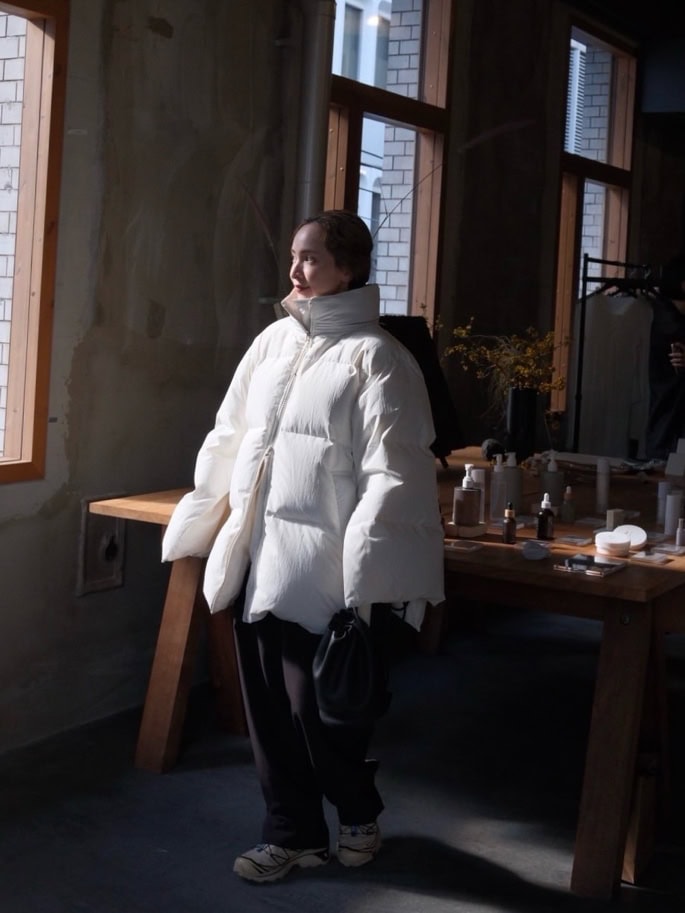 ジセルフのダウンコート、メーアのパンツ、アーバンボビーのバッグ、サロモンのスニーカー