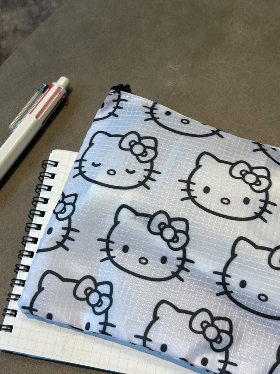 表情の異なるハローキティの総柄です。ノートやペン、ガジェットまで、こまごまとした小物をまとめて。