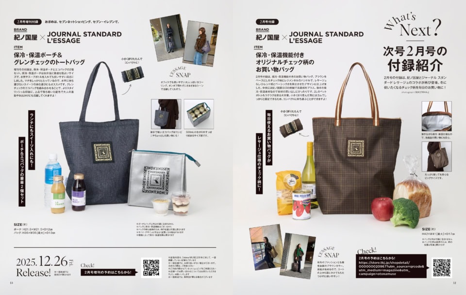 (小声)1月号のお知らせの記事で言うことではないのですが、次号、2025年12月26日発売のオトナミューズ2026年2月号の付録は紀ノ国屋とジャーナル スタンダード レサージュ様のコラボバッグです。通常号、増刊号で内容が異なります。毎年大人気で売り切れることも多いので、気になる方は早めに予約しておいてください!