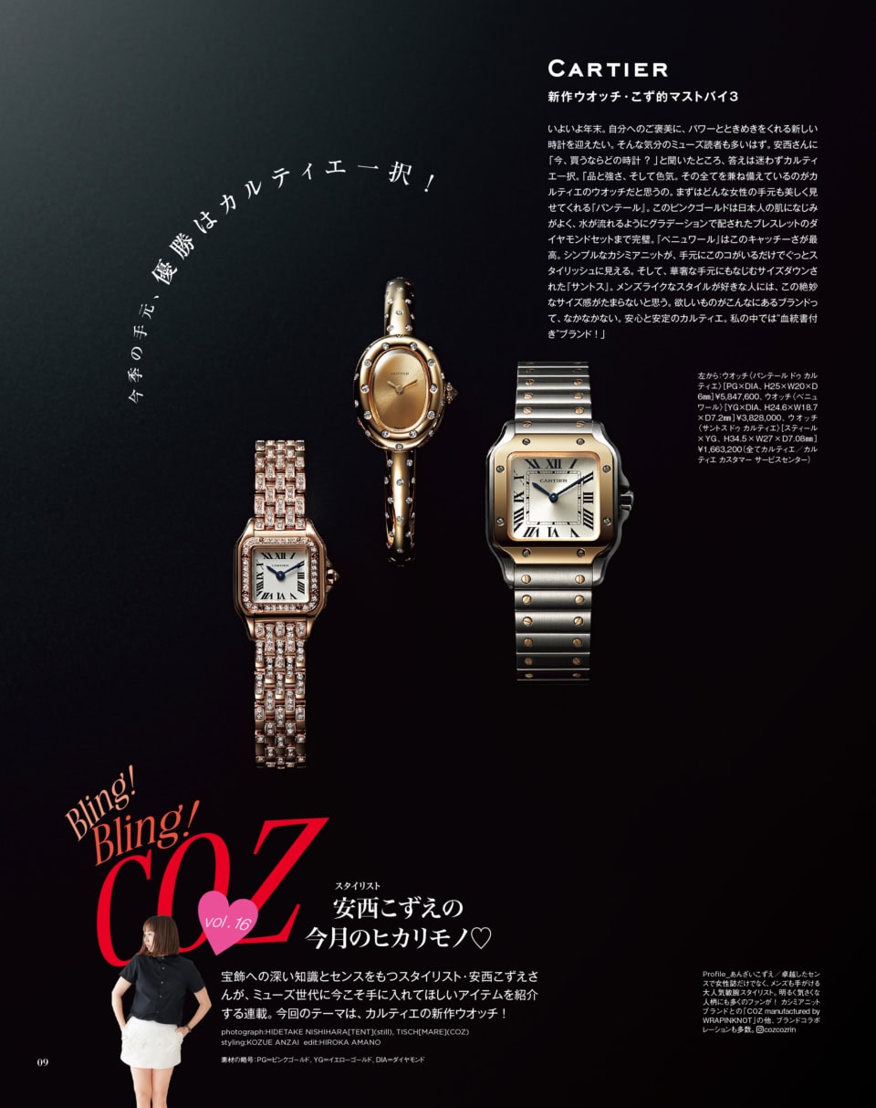 あ、連載といえば、今月の「ご褒美ラグジュアリー♥」を体現し続けているともいえる、スタイリスト安西こずえさんの連載もお忘れなく。毎月、気になったラグジュアリーアイテムを教えてくれるのですが、今月はカルティエの腕時計でした。安心と安定のカルティエ、いろいろ見てきたうえで、やっぱりカルティエ! そう言い切る安西さんの言葉には絶大な力があります。