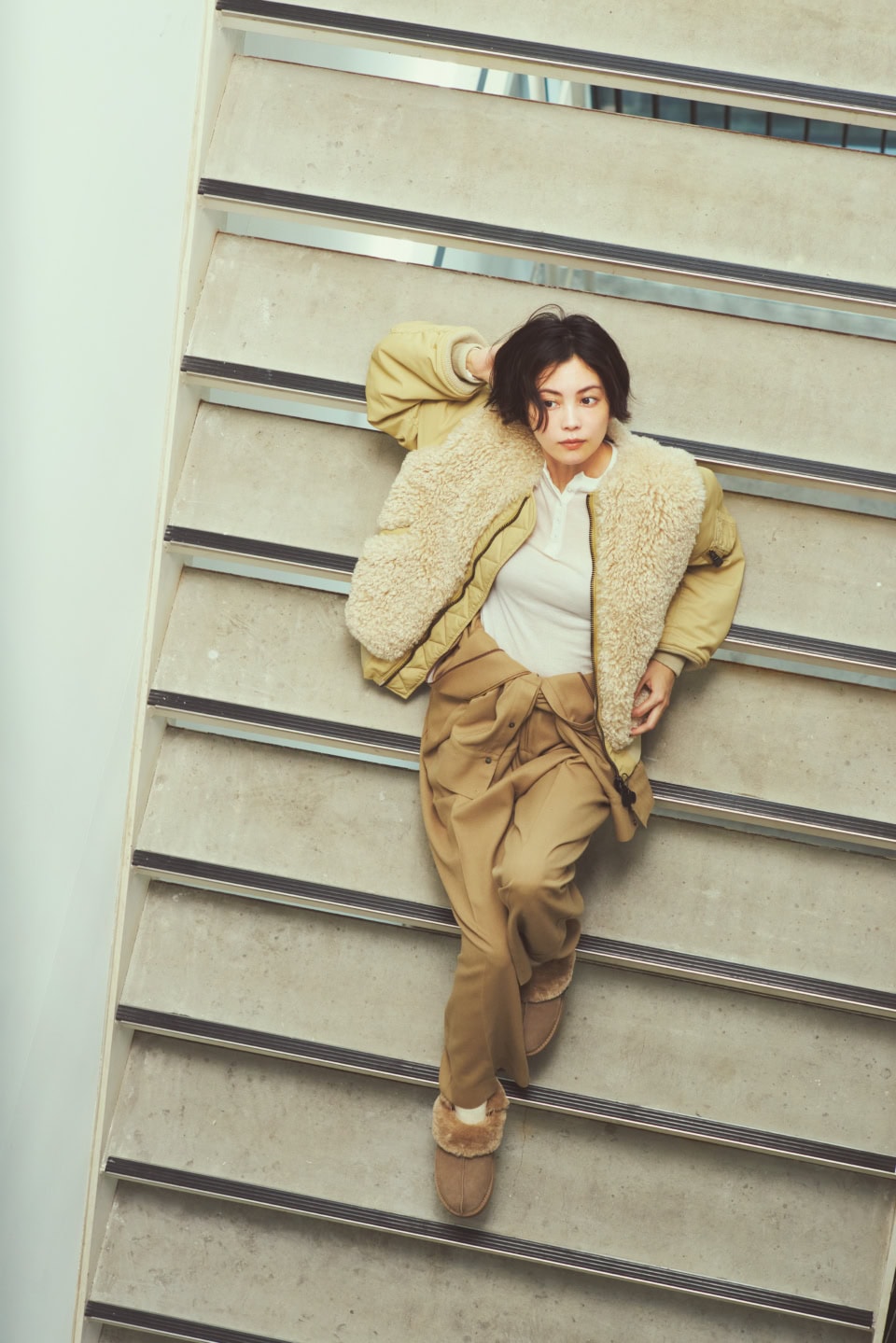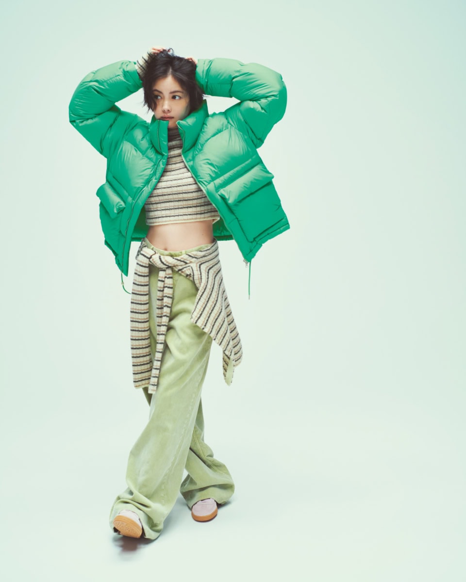 あらやだ、矢野未希子さんったら、AURALEEのダウンジャケットを着つつもお腹見えちゃってますよ、冷やさないようにね! という、季節感を無視したこの感じこそがオトナミューズスタイル!
