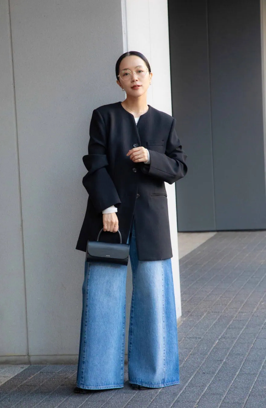 ボリュームたっぷりのワイドデニムはきちんと感のあるブラックジャケットを合わせて大人っぽく。ピアスと共に繊細なゴールドカラーの眼鏡が上品なムードを加速。