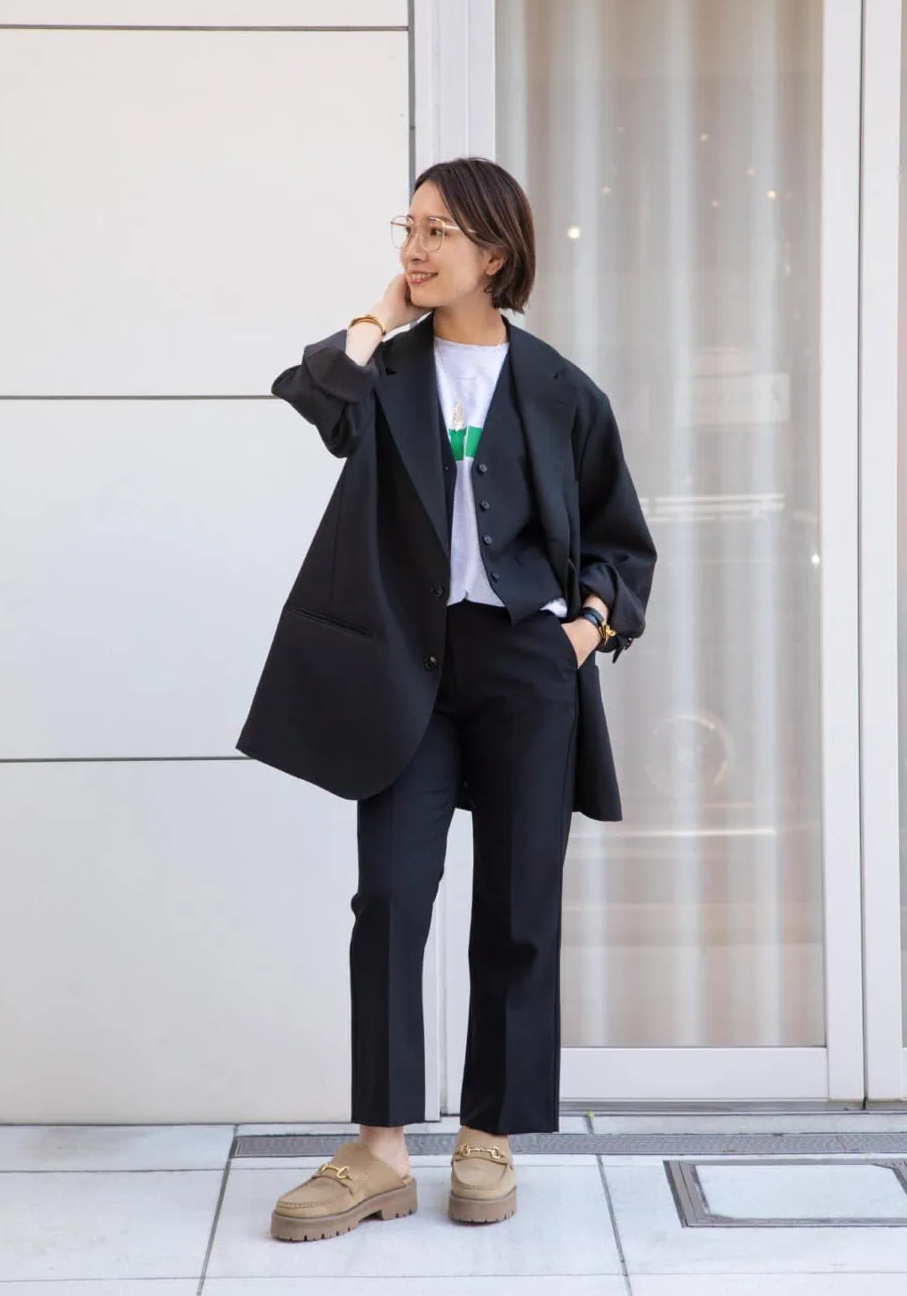 オーバーサイズのジャケットとベストを合わせたハンサムなジャケットコーデ。シューズのビットに合わせたゴールドカラーの眼鏡で女性らしいムードをプラスして全体のバランス感UP。