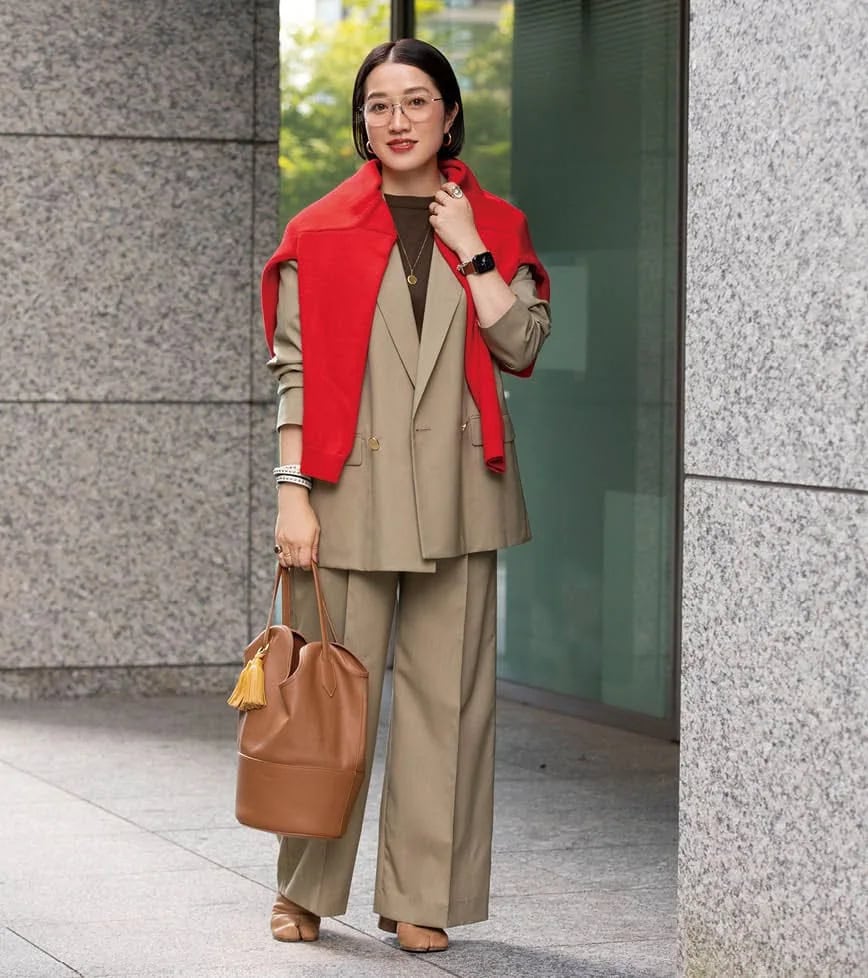 ベージュのセットアップをメインにワントーンでまとめたキレイめなスタイルは、旬のカラー、真っ赤なニットとゴールドフレームの眼鏡で華やかな雰囲気に。