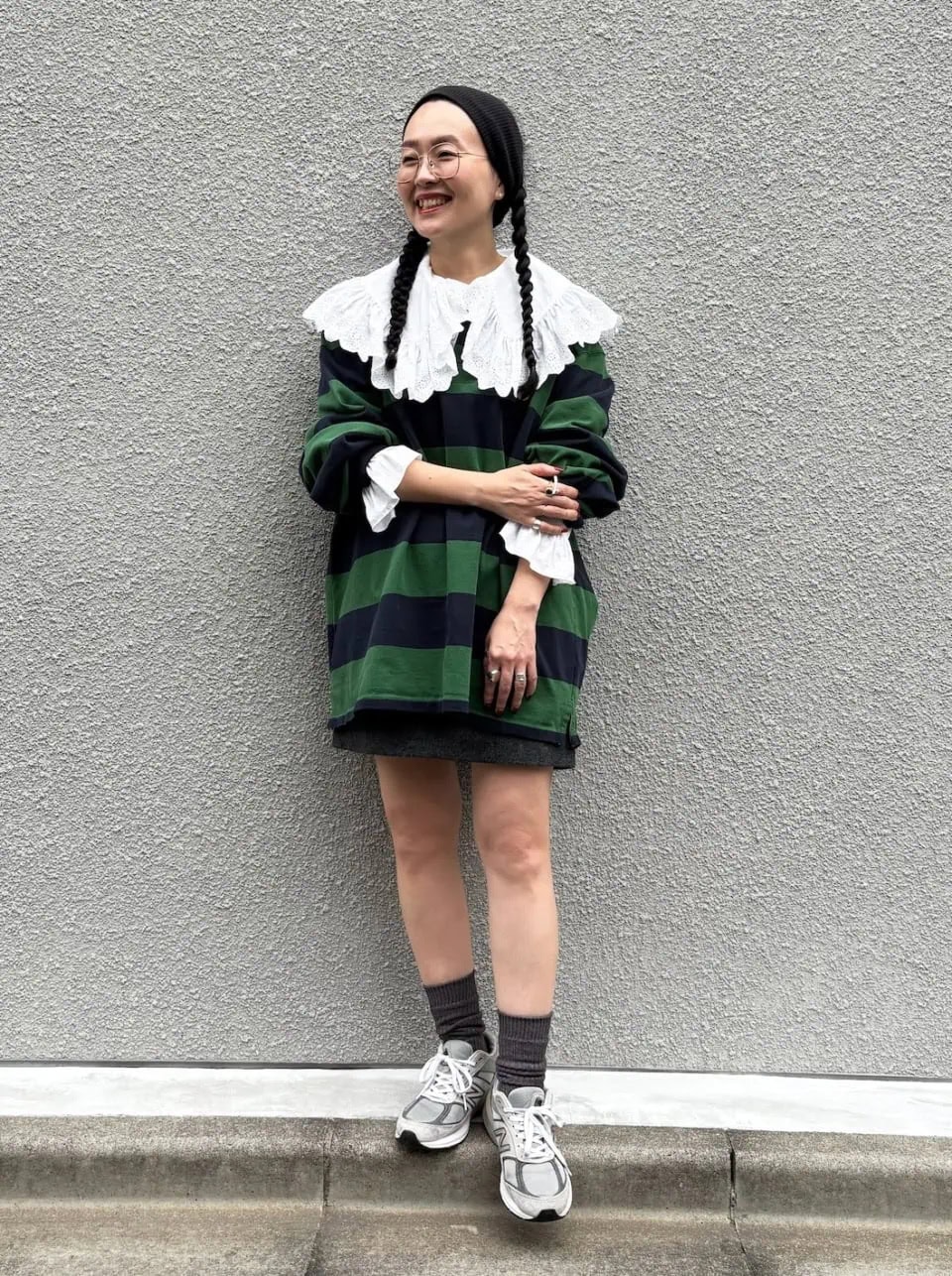 フリルたっぷりのビッグカラーブラウスにボーダートップスがキュートな大人のスポーティルック。眼鏡のメタルの質感がカジュアルな着こなしを品よくアップグレード。