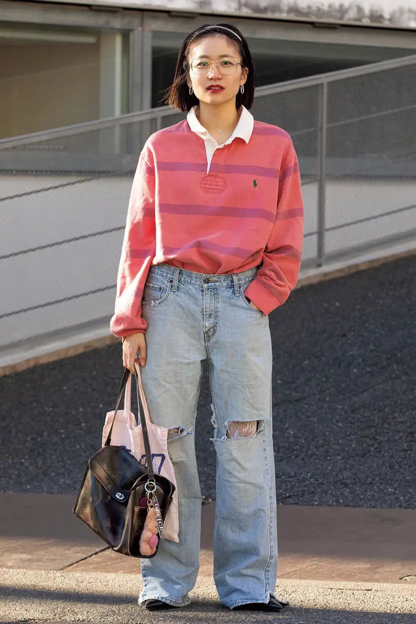 風合いのあるラガーシャツにダメージデニムというヴィンテージ感のある着こなしに、都会的な空気感をプラスするのがメタルの眼鏡。バッグともリンクしてプレッピーなムード満点!