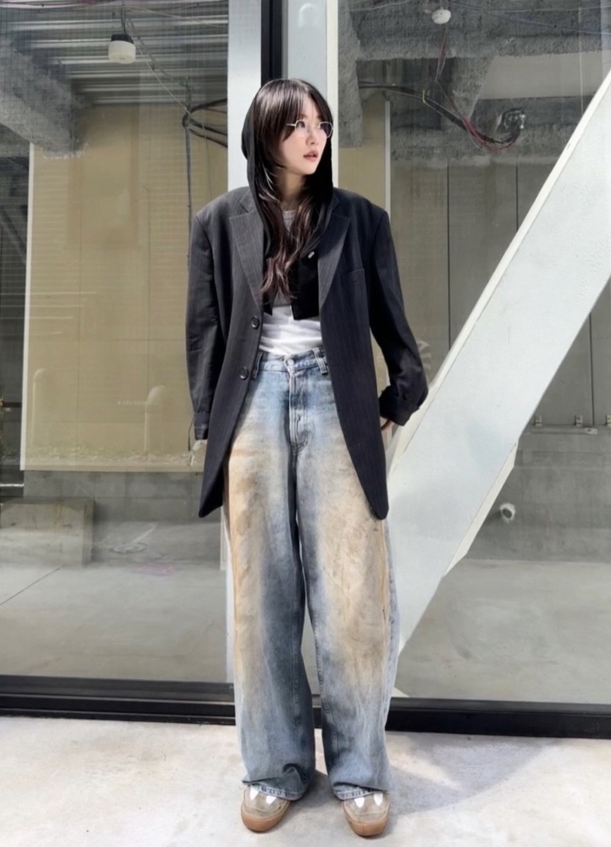 ヴィンテージのような風合いのデニムを主役にしながらも、モード&ハンサムにまとまってるのは、モダンな雰囲気漂うシルバーフレームの眼鏡がカギ。