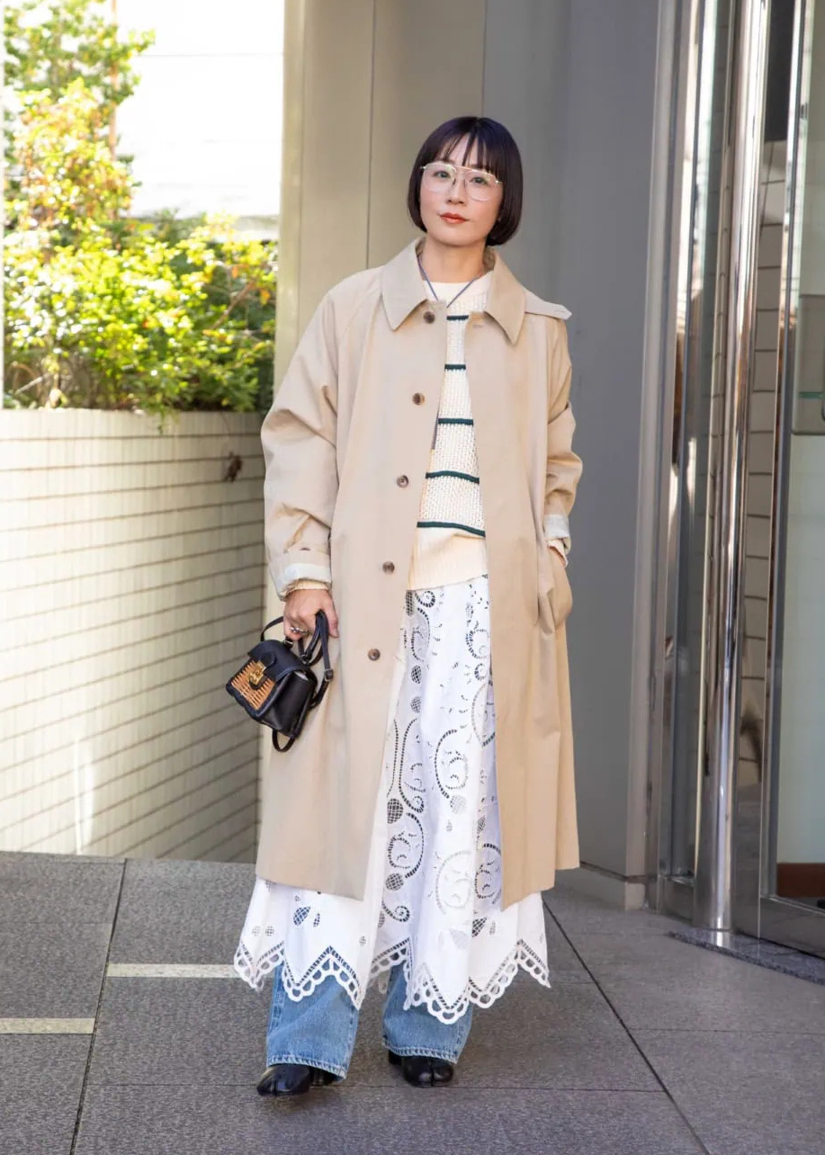 デニムパンツにコットンレースのスカートを重ねた印象的なカジュアルコーデは、トレンチコートと眼鏡でトラッド&きちんと感をプラス。華奢なフレームが奥行きのある重ね着に程よいヌケ感を。