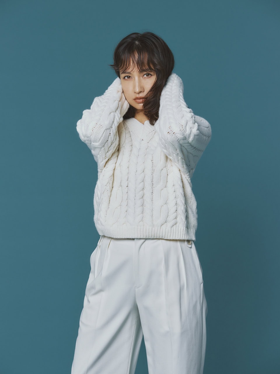 ケーブルニット¥42,900(セオリー/リンク・セオリー・ジャパン)、パンツ¥36,300(タンジェント/ザ・エディット ストア)