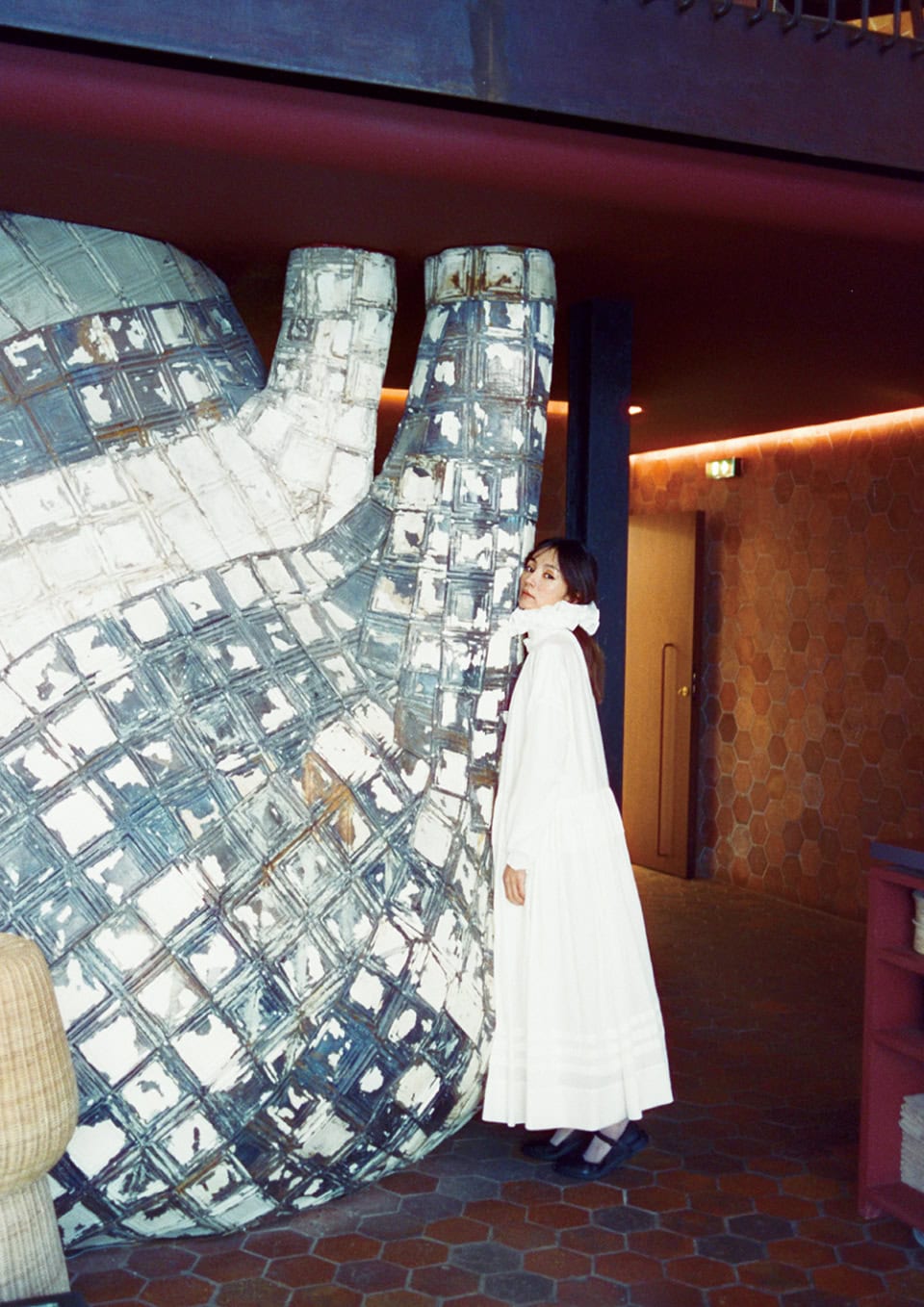 シルクコットンのドレス「Marie(マリー)」2,133€、⾸に着けたラッフルカラー ※写真のカットでは着⽤していないシャツとのセット販売「Valerie(ヴァレリー)」1,242€ ※共に参考価格(共にエコール・ド・キュリオジテ)、その他私物