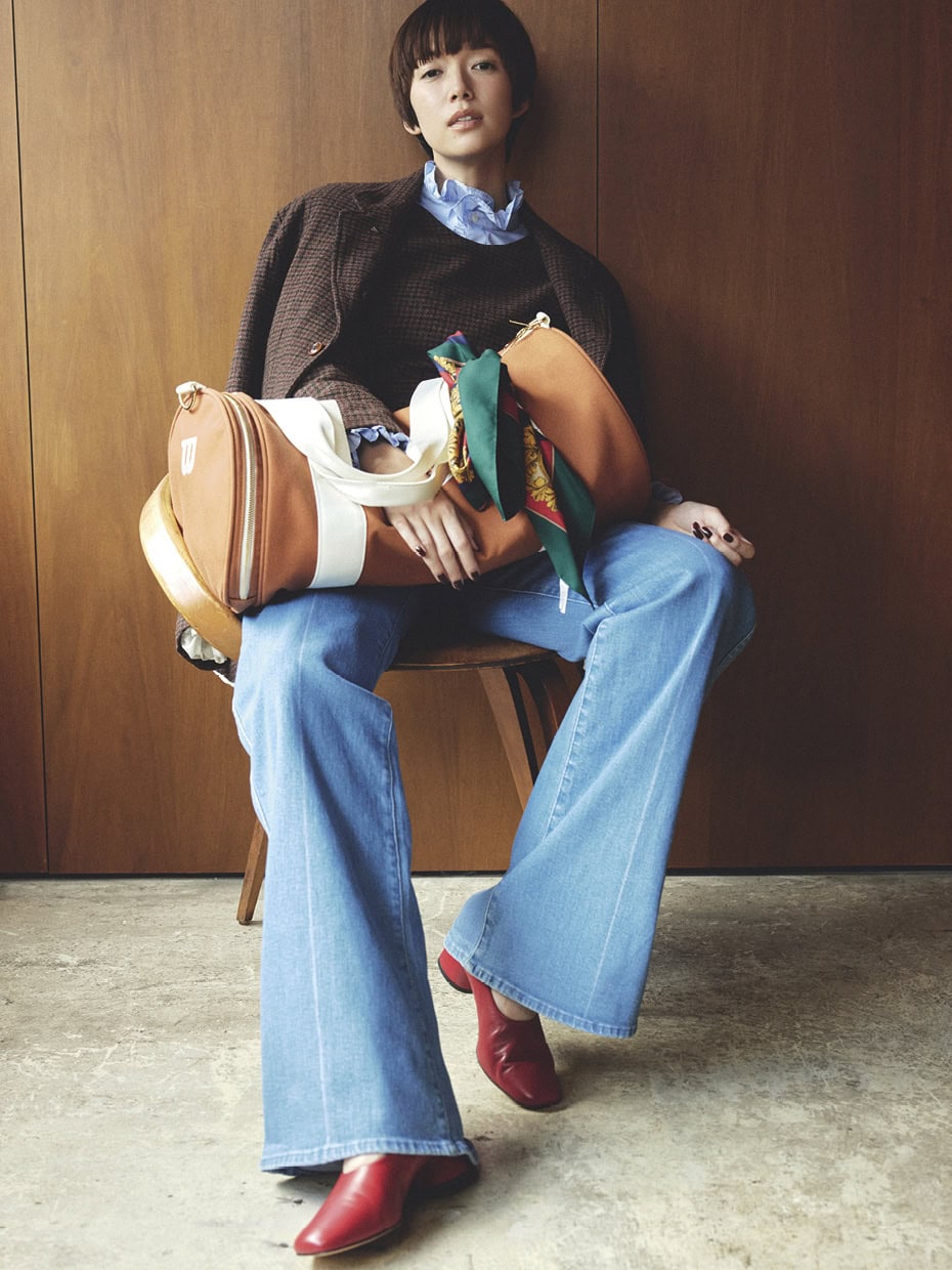 デニムパンツ¥47,300(マザー/リトルリーグ インク)、チェックジャケット¥74,800、チェックドレス¥44,000(共にジェーン スミス/ジョン メイソン スミス ジェーン スミス ストア)、中に着たシャツ¥47,300(ニアー ニッポン/ニアー)、バッグ¥16,500(ウイルソン/アメアスポーツジャパン・ウイルソンお客様センター)、バッグに巻いたスカーフ¥2,800(ロングビーチ 表参道)、パンプス¥35,200(ペリーコ/アマン)