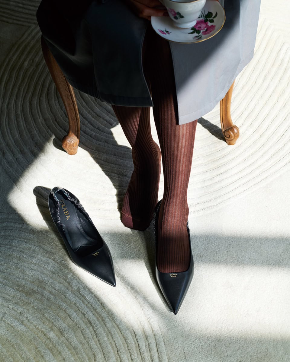 シューズ[ヒール5.5㎝]¥176,000※予定価格、コート、タイツ※共に参考商品(全てプラダ/プラダ クライアントサービス)、絨毯¥107,800/㎡(フィッシュバッハ/日本フィスバ)