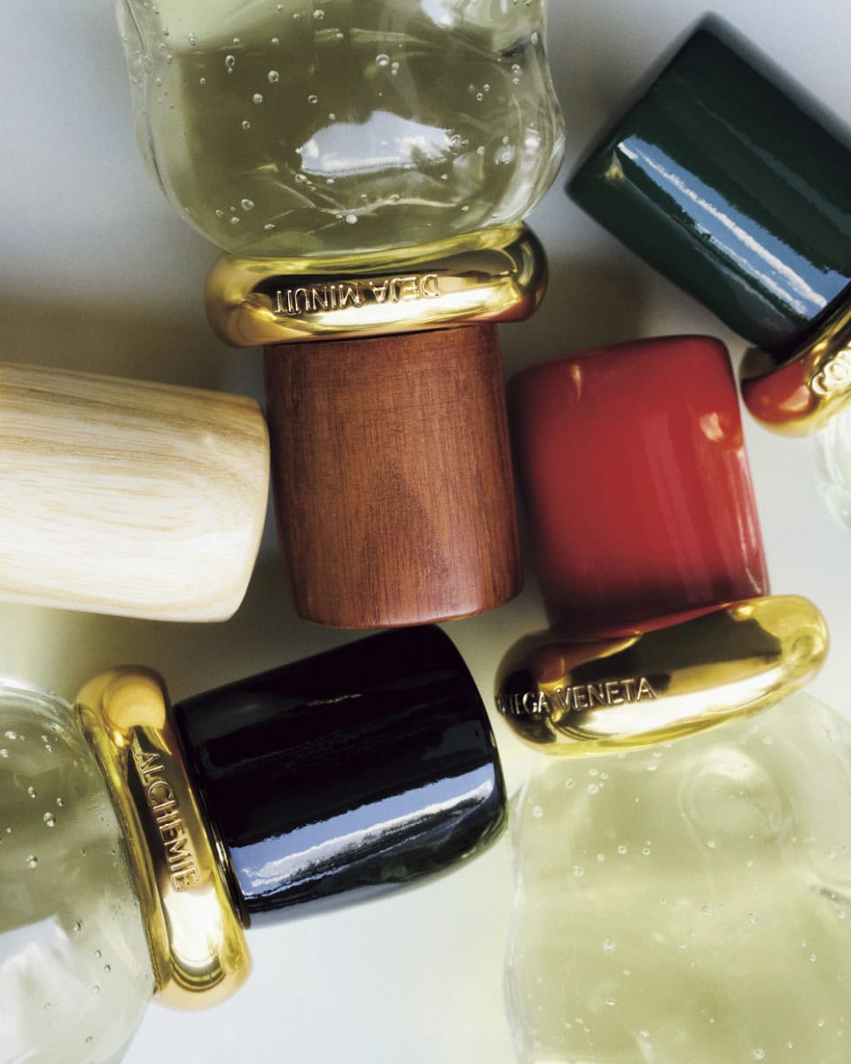 さらに“触感”へのこだわり、五感を通して世界を感じるというブランドの哲学を体現しているのが、思わず触れたくなるフォルムのガラスボトル。これはヴェネツィアの干潟やボッテガ・ヴェネタのレザーの柔らかさが着想源。ムラーノ島の吹きガラス技術を再現した気泡を含み、ひとつとして同じものはないのだそう! 香りごとに異なる色合いで仕上げられた木製のキャップ、モダンな輝きを添えるメタリックなリング、大理石の台座……、細部にまでこだわったデザインは、まるでアートピースのよう。実はこれEUなどでは既に展開があったものの、日本での発売は今回が初。ホリデーギフトにも最適!