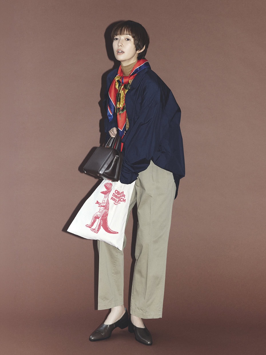 パンツ¥25,300、トートバッグ¥6,930(共にオブラダ/CINCH)、シャツ¥39,600(エイトン/エイトン青山)、中に着たタートルネックニット¥17,600(ハイク/ボウルズ)、首に巻いたスカーフ¥2,800(Long Beach OMOTESANDO)、バッグ¥51,700(プンティ/ショールーム セッション)、パンプス¥63,800(カチム)