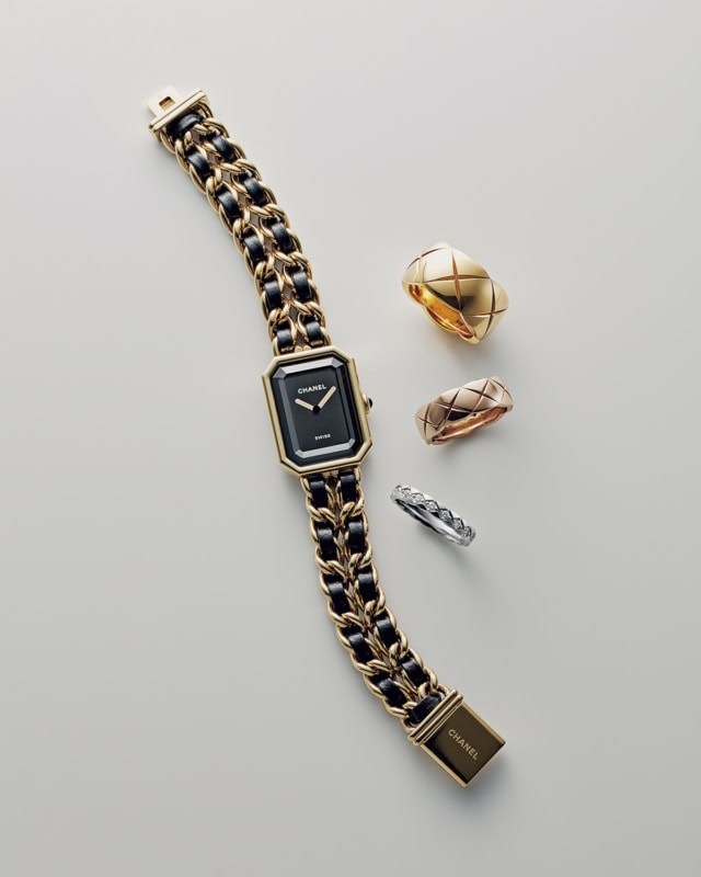 リング幅が3種類ある「ココ クラッシュ」。ミディアムのYGは個人的にタイプなのもあり、撮影用にお借りする頻度高め。主張もあって、程よくフェミニンなのがいいんです。スモールならダイヤ入りが推し。シャネル特有の色濃いファッション性を堪能できる「プルミエール」もお忘れなく。ブレスレット感覚で着けられるから、ガチな時計は柄じゃないって人やベーシックな服装が好きな人には最高のパートナーかと。そして何より、私たち世代にとってはやっぱり永遠の憧れですよね。