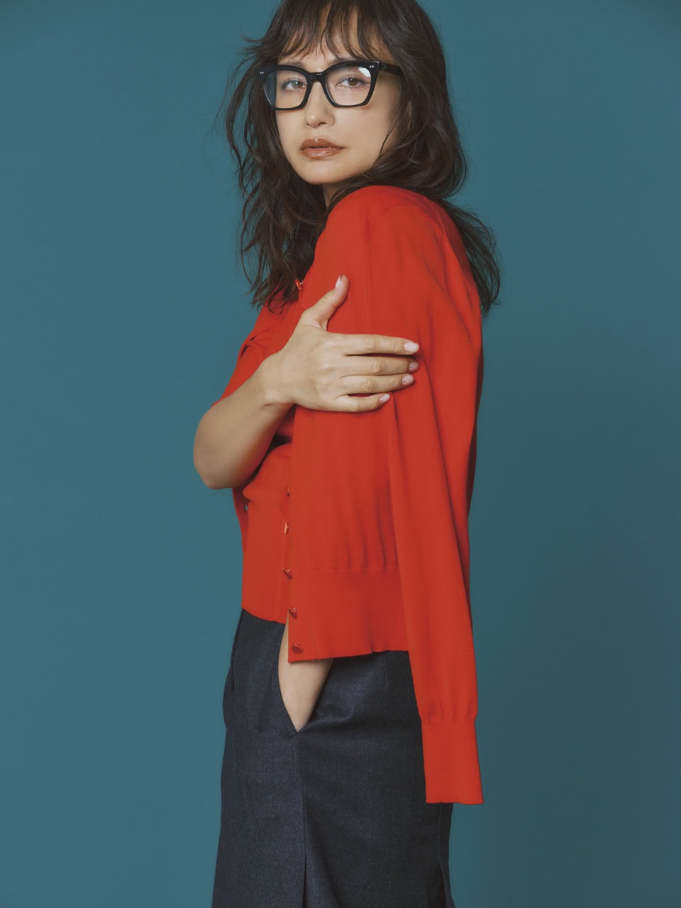 Vネック半袖ニット¥24,200、カーディガン¥26,400(共にエストネーション)、スカート¥42,900(セオリー/リンク・セオリー・ジャパン)、眼鏡¥54,780(オリバーピープルズ/ルックスオティカジャパン カスタマーサービス)