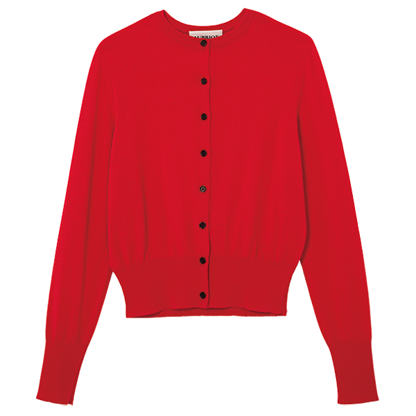 「上質なノンミュールジングウールを使用していて、肌触り最高!」。シーズンレスで着用可能。Vネックニット¥48,400(オブリオ)