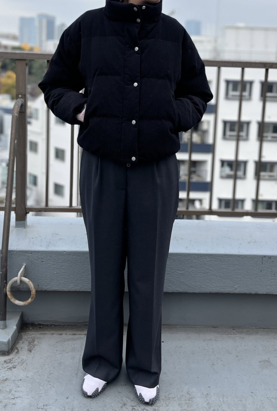 掲載カラーのブラウンは似合わなかったので(泣)、筆者は大好きな黒をチョイスしてみました。コーデュロイってともすると野暮ったく見える素材なのですが、黒をチョイスするとスマートな印象になるんですね。比較的モノトーンの服が多いので、すごく取り入れやすかったです。