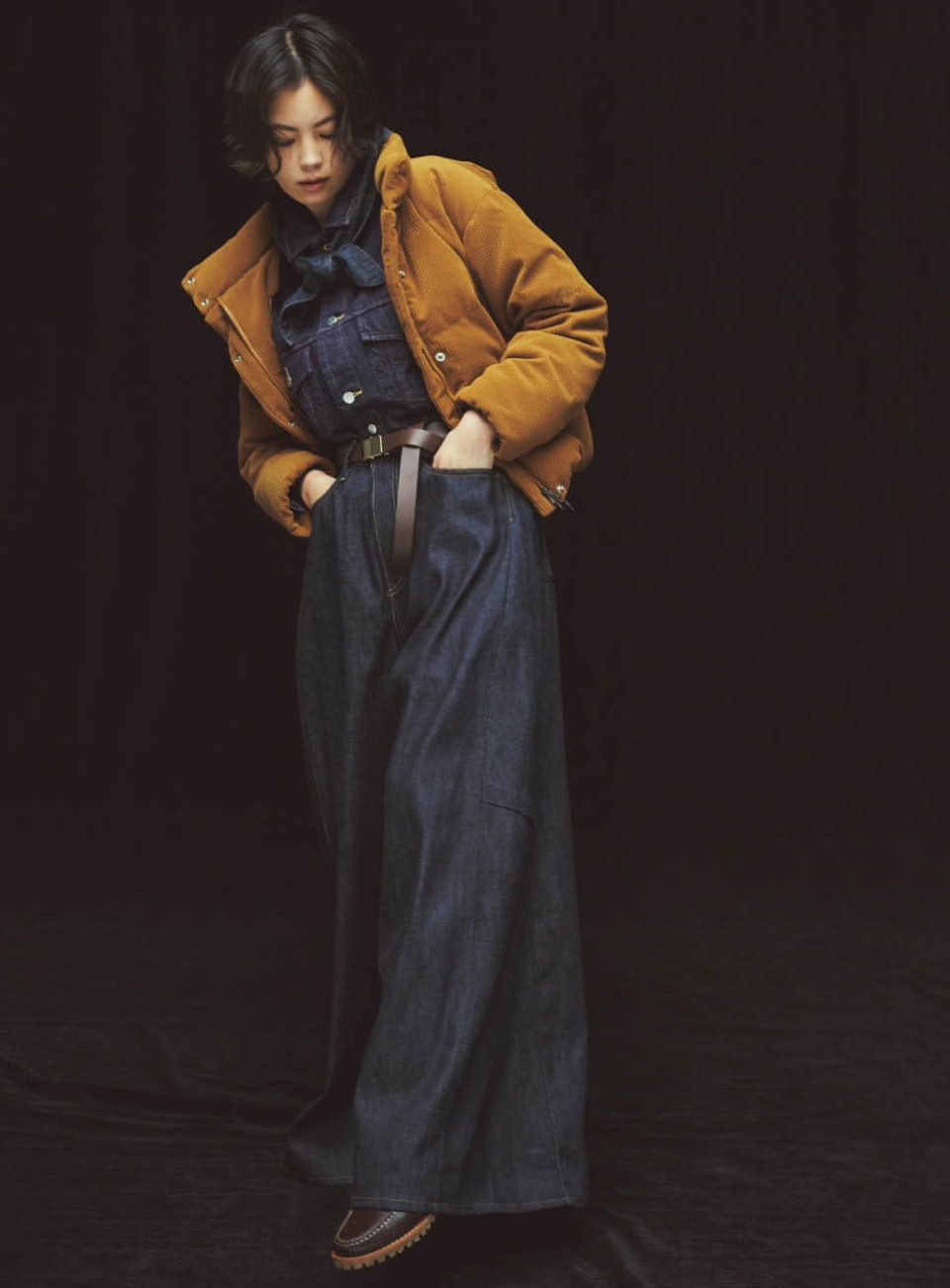ダウンジャケット¥51,700(ナンガ)、デニムジャケット¥38,500(サージ/ショールーム セッション)、デニムパンツ¥44,000(ハイク/ボウルズ)、ベルト¥12,100(レフィエ/オブリオ)、シューズ¥25,300(ティンバーランド/ロンハーマン)