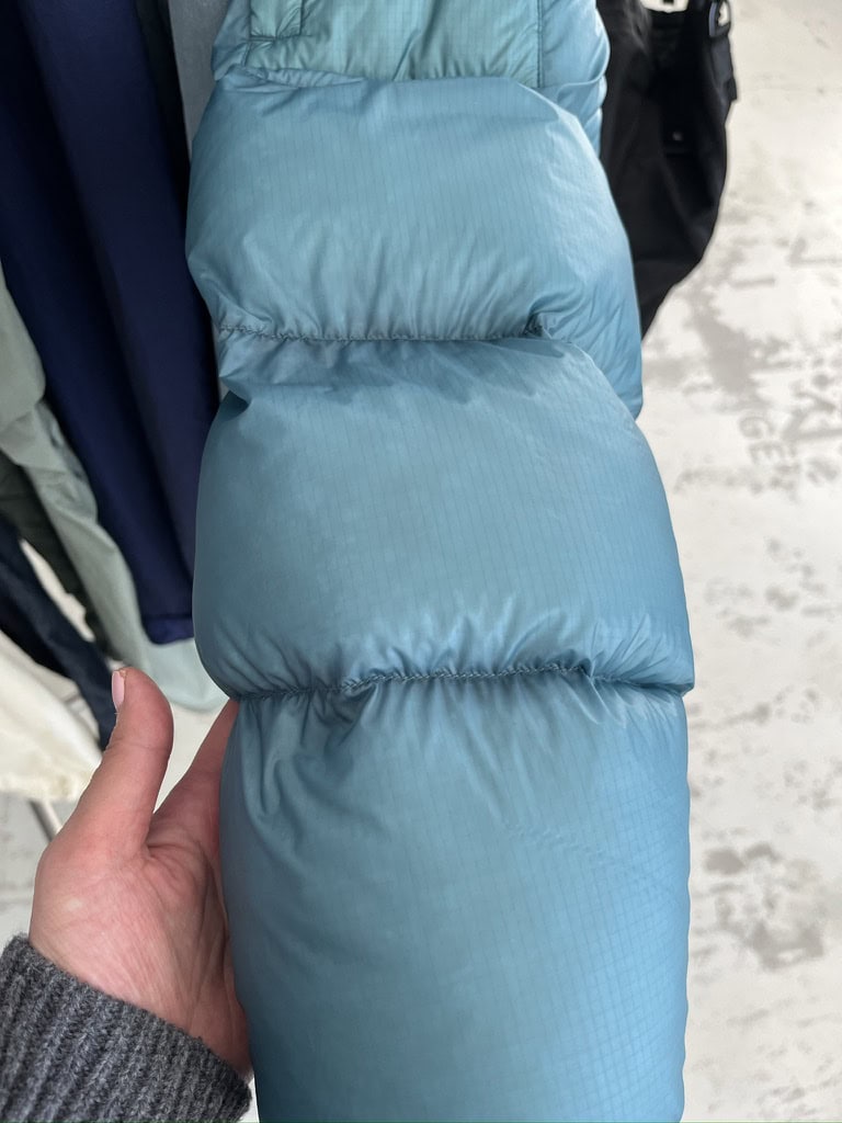 わかります? 驚くほど薄いリップストップナイロンなので、中のダウンが透けて見えるんです!