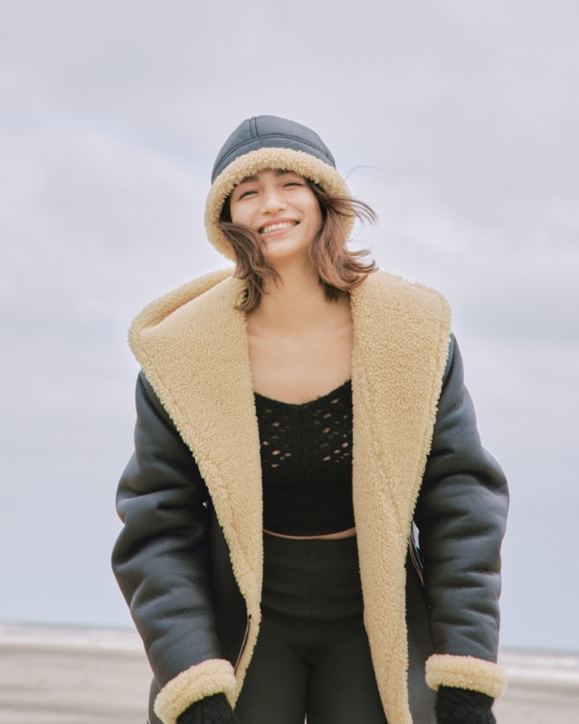 ムートンコート¥418,000、ニット¥62,700、パンツ¥63,800、ハット¥61,600(全てフミカ_ウチダ/クリフ)
