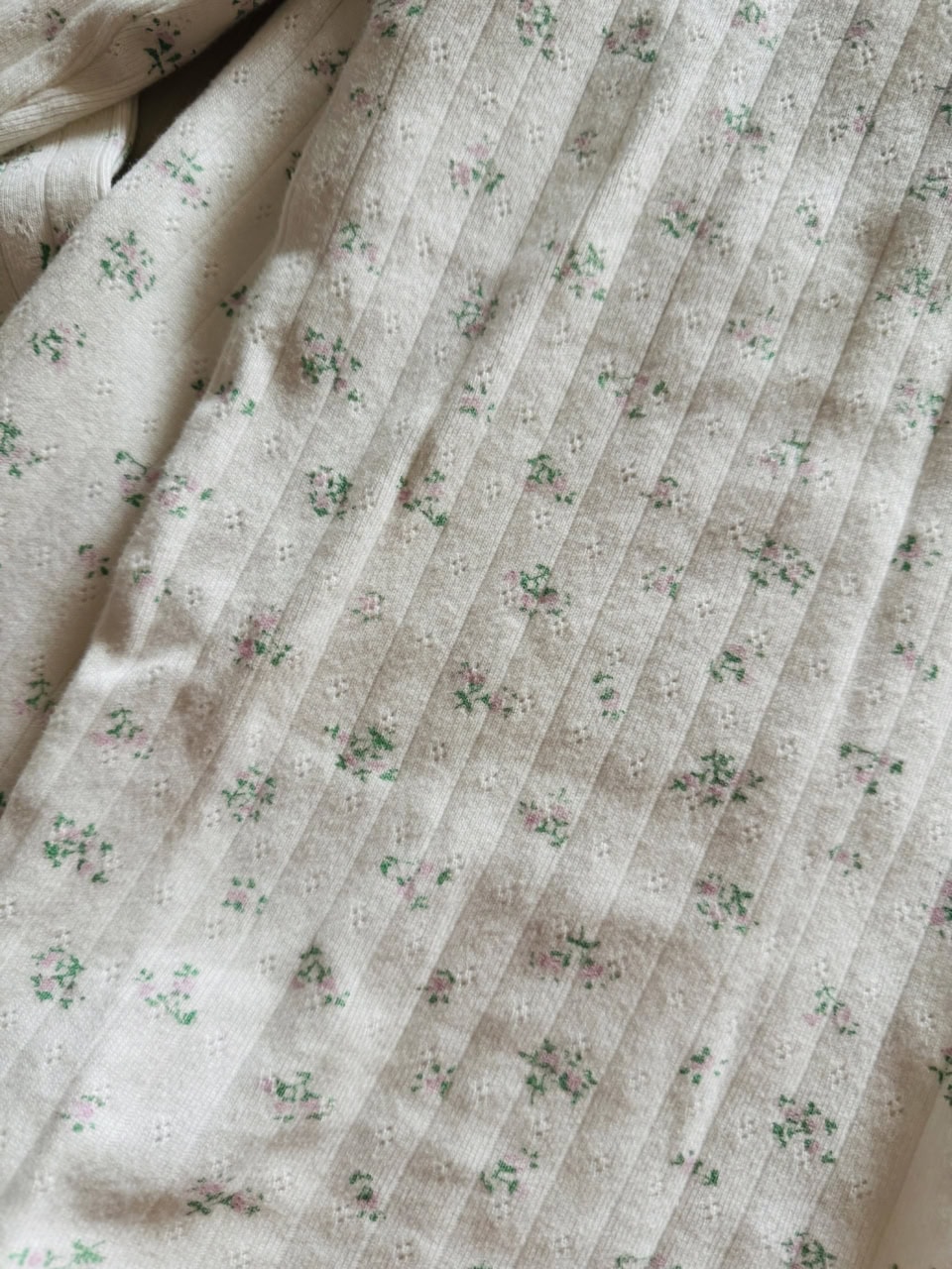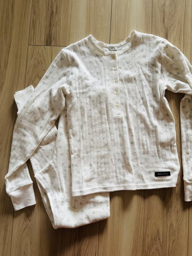 若かりしころからサーマルが大好きでたくさん持っているのですが、同じテンションで着られるこのアイレットリブシリーズに一目惚れ。白とグレーのヘンリーネックトップス、白のレギンスを大人買いしました。白とグレーのほかに、ピンクもあります。どこか懐かしく、心ときめく小花柄がたまりません! 首元とウエストのラウンドステッチも可愛いし、Seavallyのニットパッチもポイントに。