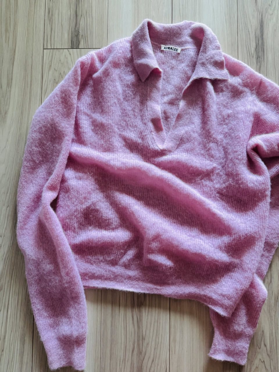 毎シーズン、ついつい散財してしまうオーラリー。このニットも買うはずではなかったのですが、どうしても欲しくなり購入。この見た目、どうです? 希少なベビースーリーアルパカのタムヤーンを使用しているそうで、極上の滑らかさとふわふわ感。そして、ピンク! スキッパーポロで、甘くなり過ぎずに今っぽく着られるところもグッドです。下にシンプルなロンTを合わせるだけでサマになる~。