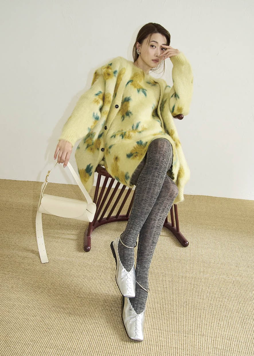 バッグ〈カンノーロ〉[H11×W29×D10㎝]¥250,800、シューズ〈バレリーナ〉[ヒール1.5㎝]¥159,500、カーディガン¥489,500、ニットドレス¥390,500、ピアス¥93,500(全てジル サンダー/ジルサンダージャパン)、タイツ¥3,850(エミリオ カヴァリーニ/ぽこ・あ・ぽこ)