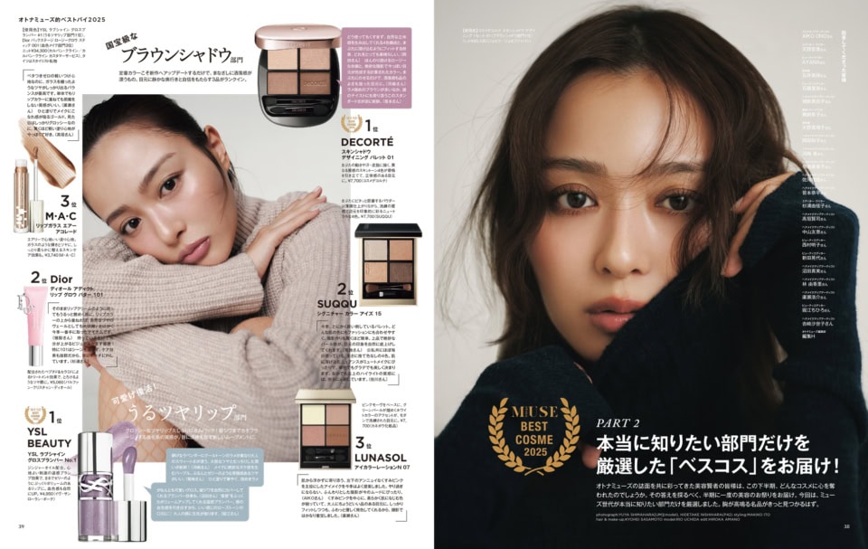 そして皆さん、2月号ですよ。そう、シーズン・イン・ベスコス! 毎年、各誌がベストコスメを発表していますが、オトナミューズは思いました、「み~んなやって同じようなもの出してるからさ、ウチは本当に欲しいものだけでよくない?」と。アイシャドウは、み~んな使いたいブラウンだけ! リップは潤うやつだけ! コスメは要るものの情報を知りたーい!