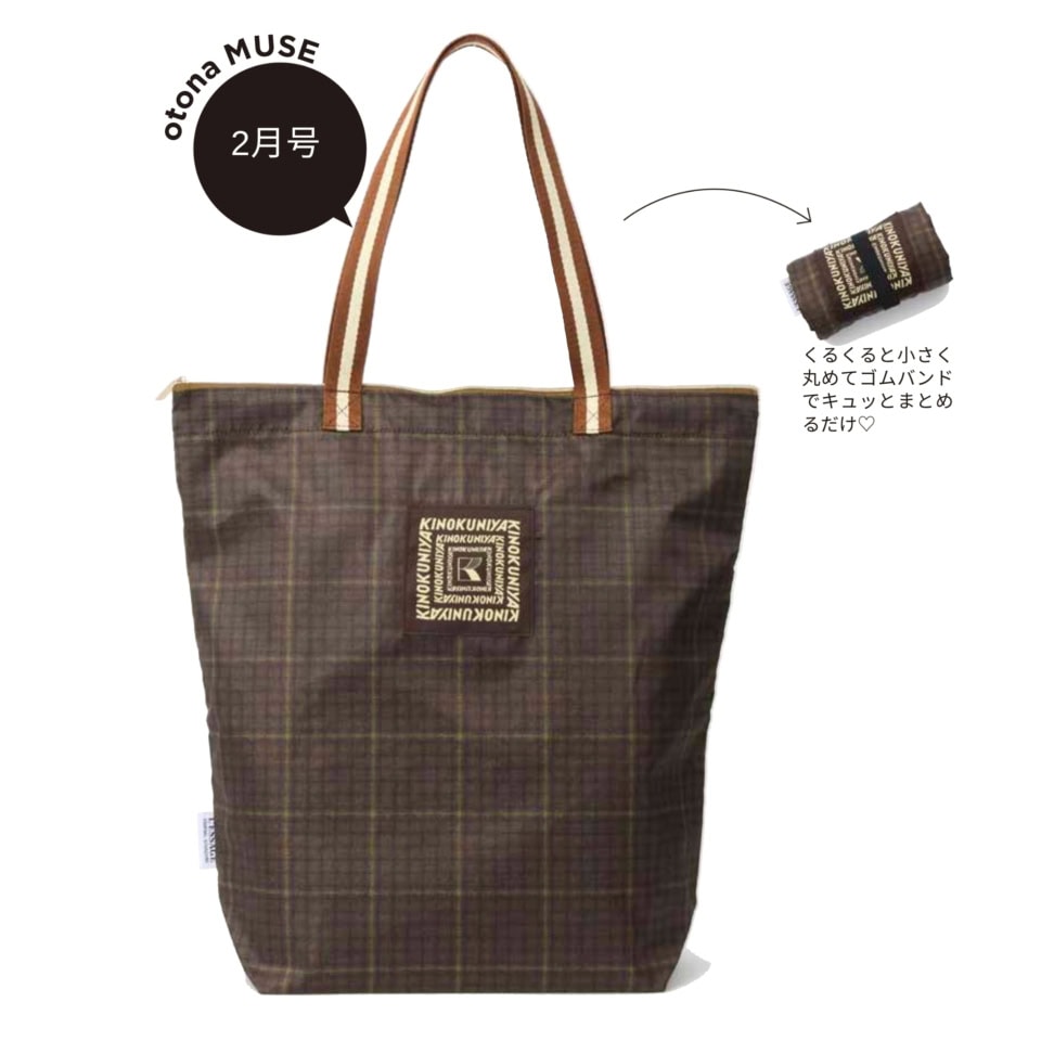 2月号のオトナミューズ付録は、保冷・保温機能付きのお買い物バッグ。トレンドのブラウンを基調としたチェック柄はジャーナル スタンダード レサージュのオリジナル柄。高級感溢れる紀ノ国屋ロゴを刺繍で施し、さらにレジメンタルのハンドルでデザイン性の高いバッグに仕上げました。薄くて軽く、小さくたたんで持ち運べるのもポイント。