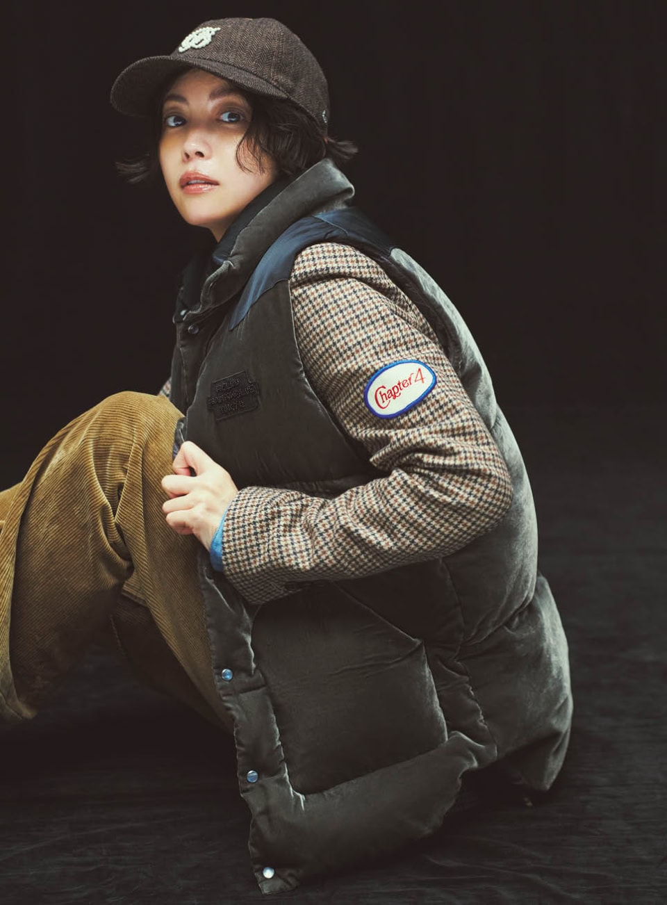 ダウンベストフェザーベルベット¥176,000、ジャケット¥159,500、ウエスタンシャツ¥69,300、コーデュロイパンツ¥71,500、キャップ¥26,400(全てマディソンブルー)