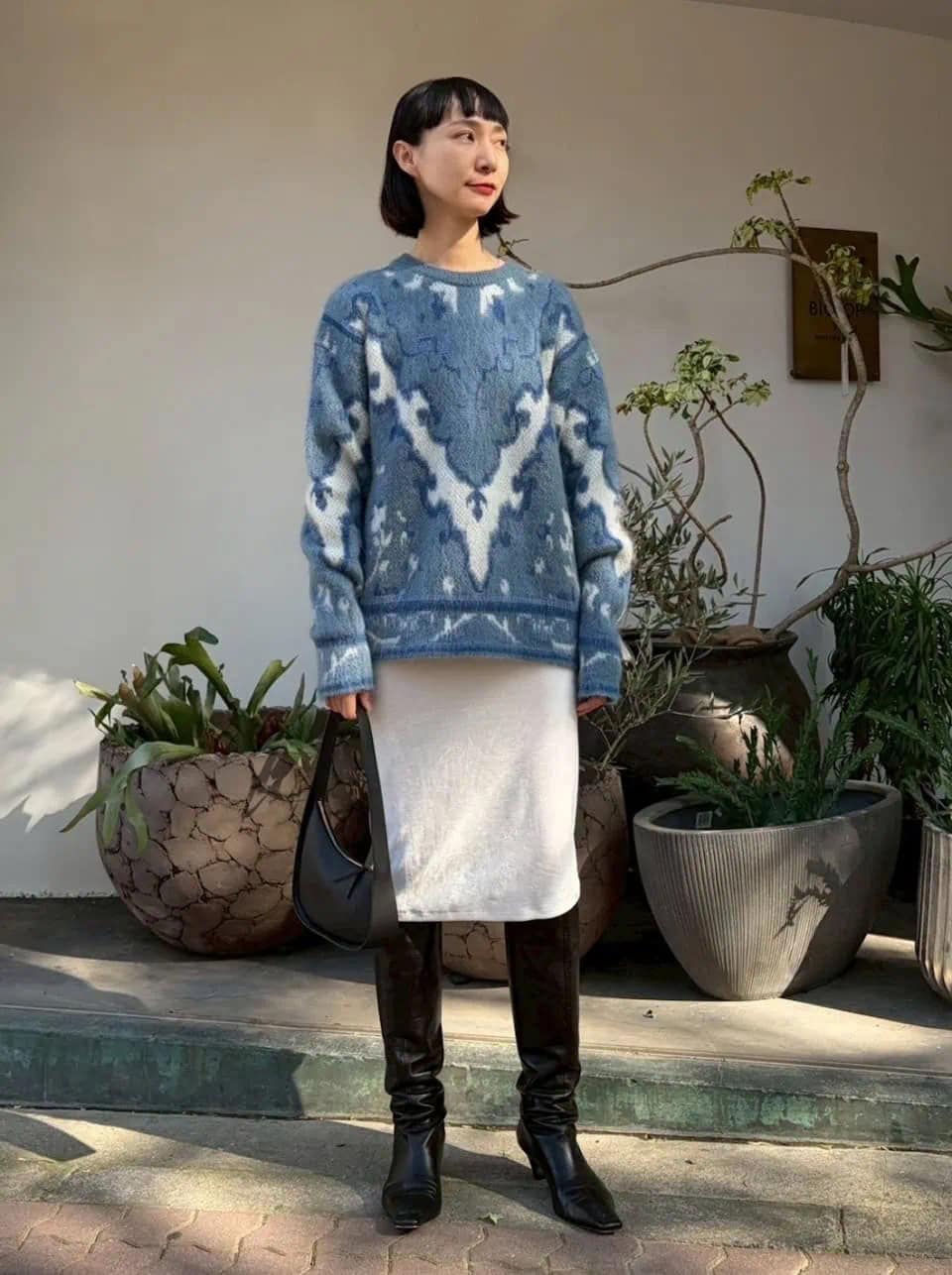 ニット¥194,700(クリスタセヤ/ビオトープ)、スカート¥31,900(ヨー ビオトープ)、ケイトのブーツ、その他は全て本人私物